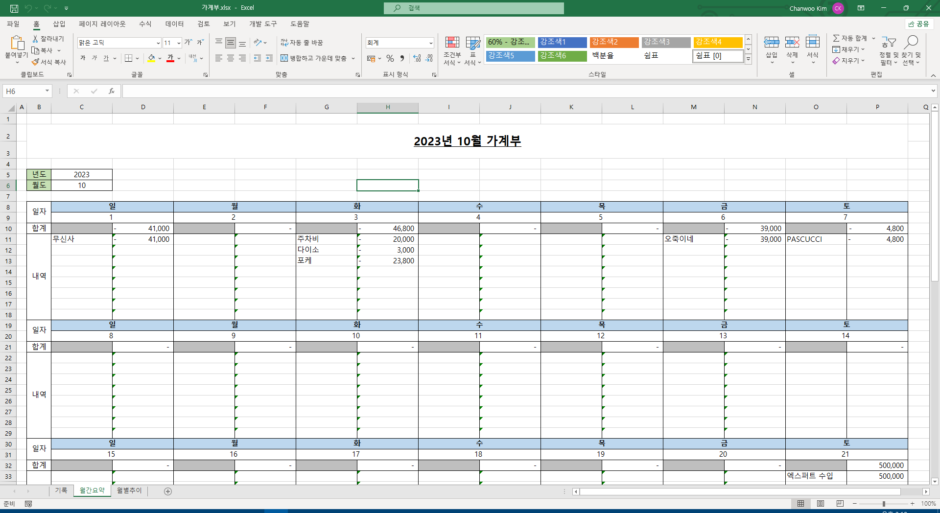 2. 월간요약sheet에서는 월간 가계부내역을 한눈에 볼 수 있습니다.