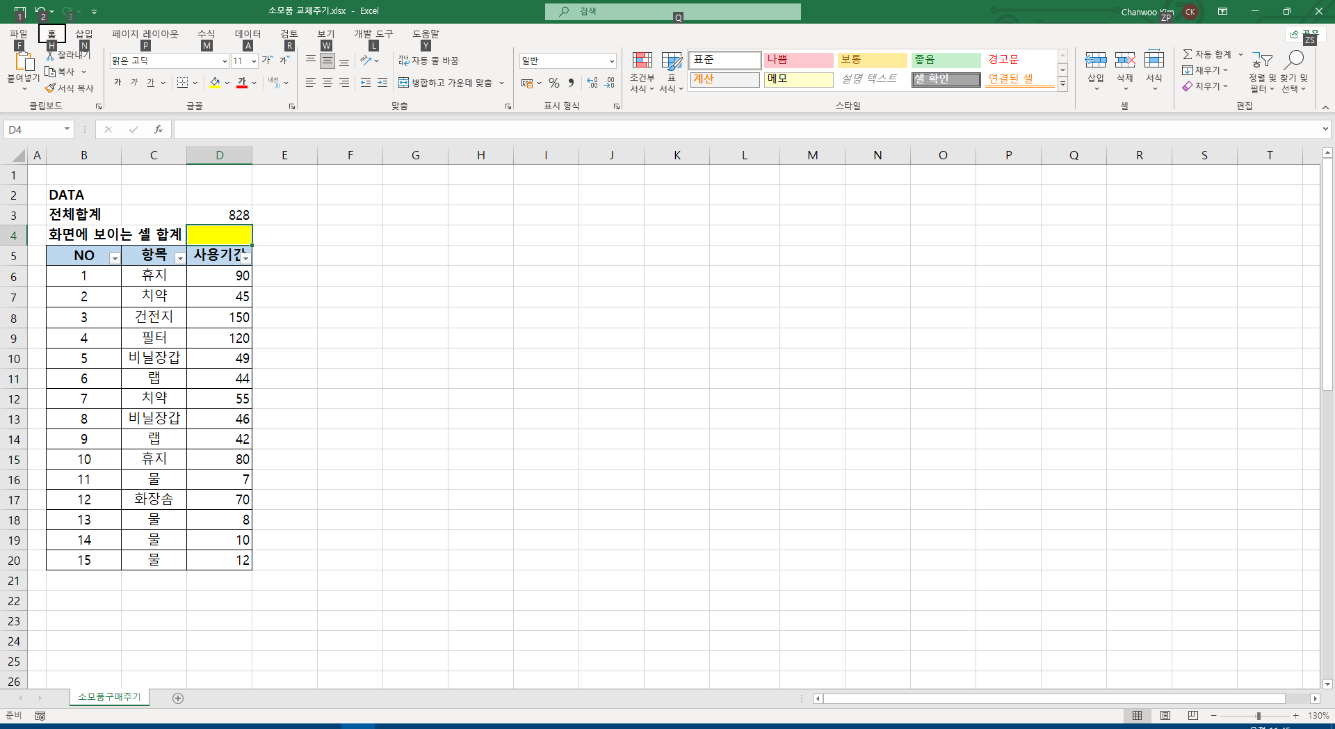 1. 입고 시트에 입고내역을 일자별로 기록합니다.