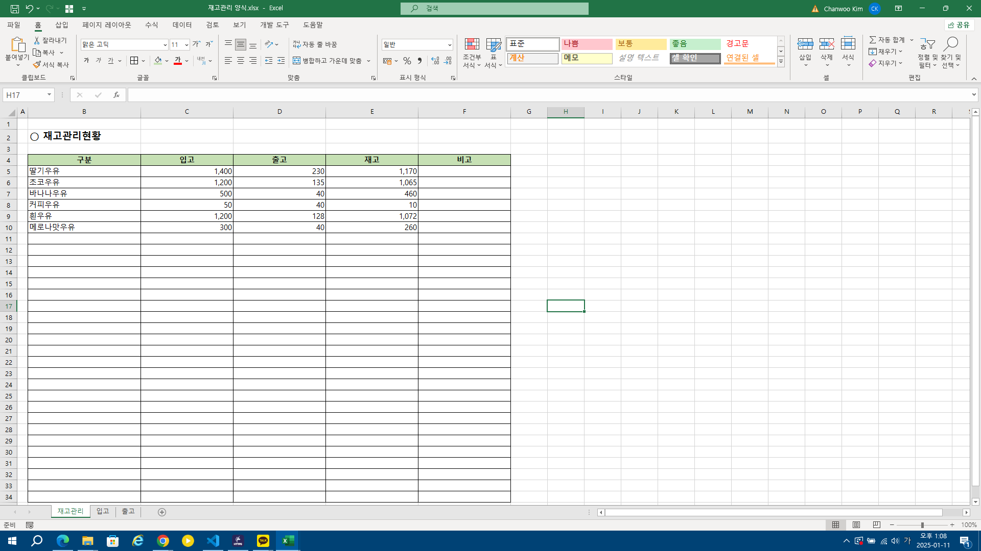 입고현황과 출고현황을 입력하면 남은재고를 계산해주는 양식입니다.